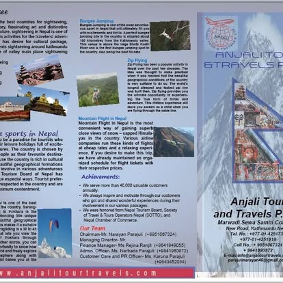 Anjali Tour & Travels P. Ltd. is a Nepal-based travel agency that provides a wide range of tourism and travel services for both domestic and international clients. The company specializes in organizing tour packages, flight ticketing, hotel reservations, sightseeing trips, pilgrimage tours, and customized travel itineraries across Nepal and other destinations. With a focus on customer satisfaction and convenient travel planning, Anjali Tour & Travels P. Ltd. caters to popular destinations such as Kathmandu, Pokhara, Chitwan, Lumbini, and major Himalayan trekking regions. The company aims to provide reliable, affordable, and well-organized travel services, ensuring smooth and enjoyable travel experiences for its clients.