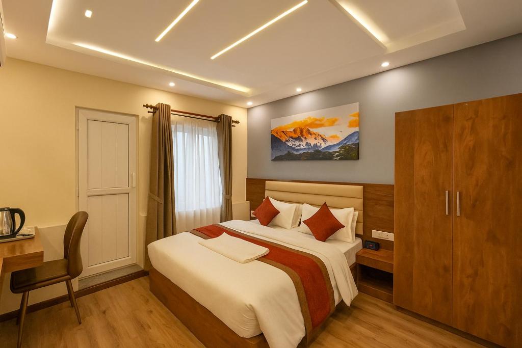Kathmandu Royal Chamber Hotel is a newly opened 3-star property located on Pashupati Road in Battisputali, Kathmandu, just 2-3 minutes from Tribhuvan International Airport and within walking distance of Pashupatinath Temple . The hotel features 150-200 air-conditioned rooms equipped with 43-inch LCD TVs, free WiFi, electric kettles, mini swimming pool, and private bathrooms with free toiletries, hair dryers, and slippers; select rooms offer balconies with Himalayan views . Guests can enjoy à la carte breakfast daily (continental, American, Asian, vegetarian, and halal options) and dine at the rooftop restaurant serving American, Indian, and Asian cuisine, or relax at the bar/lounge . Amenities include a sun terrace with mountain views, spa, shared lounge, 24-hour front desk, currency exchange, tour desk, laundry services, and free on-site parking . The hotel is 1.6 km from Pashupatinath Temple, 3 km from Boudhanath Stupa, and 4.5 km from Kathmandu Durbar Square, with paid airport shuttle service available 24/7 . Guest reviews (rated 9.6/10) consistently praise the exceptional staff, spotless cleanliness, excellent location, and great value for money .