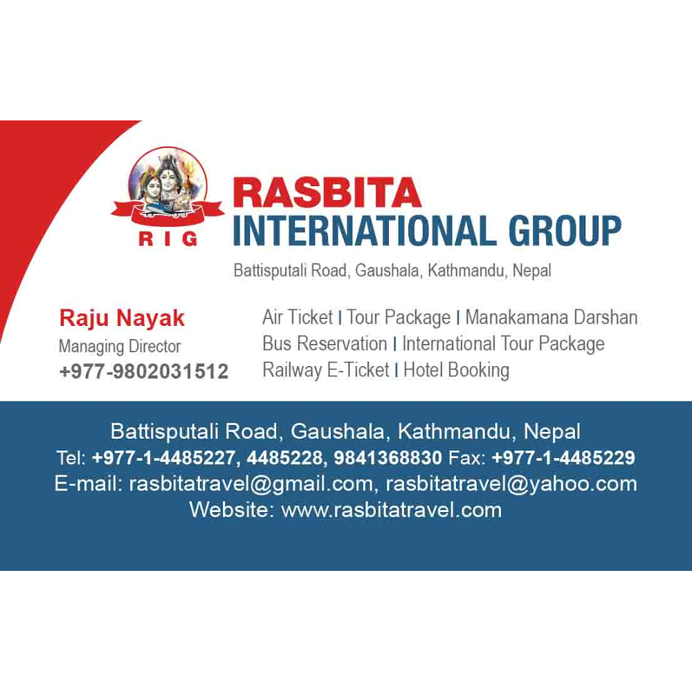Rasbita International Tours and Travel (Rasbita International Travels & Tours Pvt. Ltd.) is a well-established travel agency based in Kathmandu, Nepal, located in the Battisputali/Gaushala area. It is a licensed and registered company that provides a wide range of travel services such as domestic and international flight ticketing, holiday tour packages, hotel bookings, travel insurance, visa assistance, and transportation arrangements. The company also offers customized tour planning, group travel services, and corporate travel solutions. Rasbita is known for its strong focus on air ticketing and travel management services, and it is also involved in related services like remittance and complete travel consultancy. It is affiliated with Nepal’s tourism and aviation networks and serves both local and international clients.