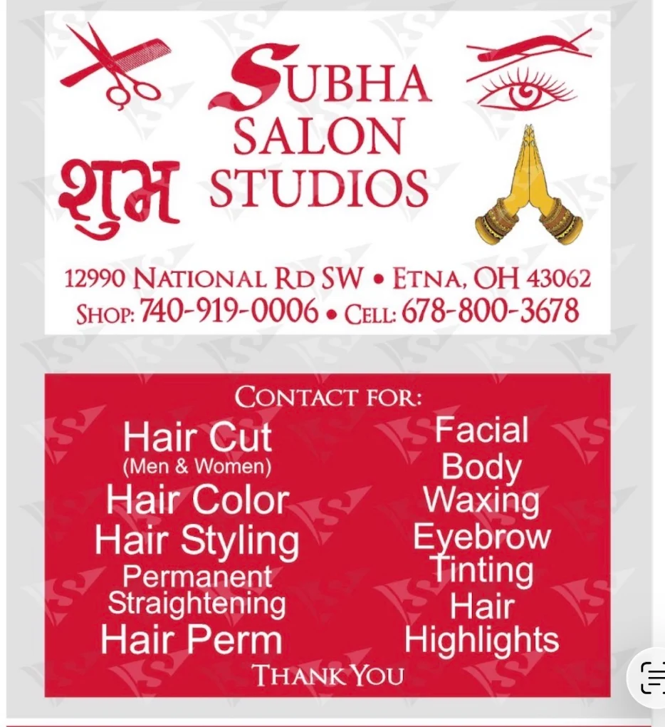 Subha Salon Studios provide hair and skin care services at affordable prices. Come visit us at 12990 National Road SW, Etna OH 43062 at the intersection of Mink Road and National Road in Etna Township. Please react out at 740-919-0006 or 678-800-3678 for any questions or concerns. Walk-ins are welcome too. Thank You.